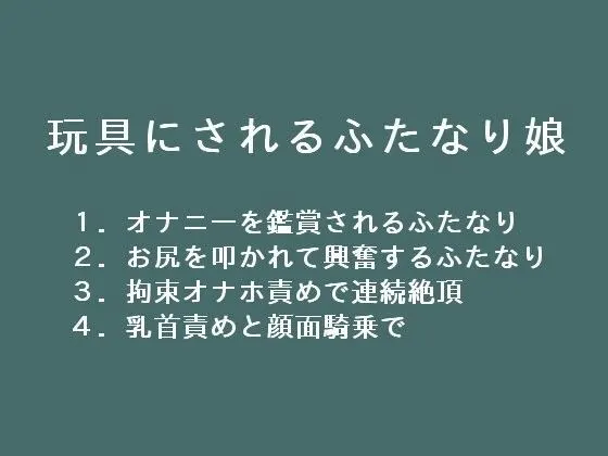 ふたなり娘をSッ気のある女の子が責める話です。 基本的にふたなり娘が一方的に責められたり、弄ばれたりします。 ふたなり娘も愉しんでいるところがあるので、虐め要素は少ないです。 1.オナニーを鑑賞されるふたなり プレイ内容 上靴の匂いを嗅ぎながらオナニー 2.お尻を叩かれて興奮するふたなり プレイ内容 お尻を平手打ち、蹴られる 3.拘束オナホ責めで…